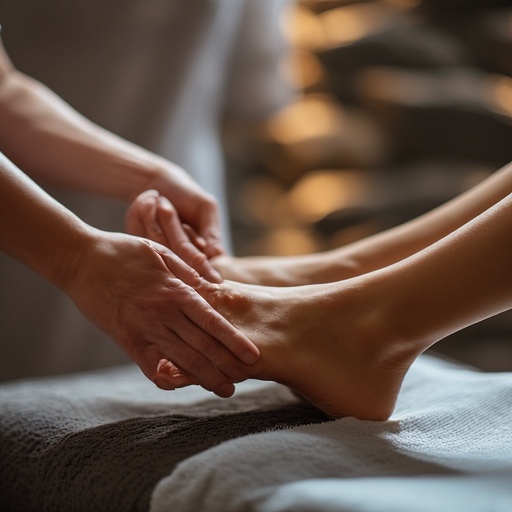 Masáž dolních končetin, zahrnující stehna, lýtka, kotníky a chodidla, se provádí ze zadní i přední strany, přičemž se používají dlouhé, plynulé tahy a jemný tlak střídající se s hlubšími hmaty pro lepší prokrvení a uvolnění svalů.